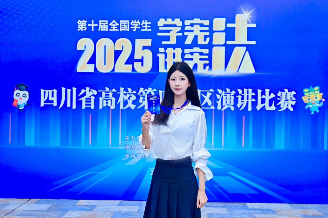 本次比赛由四川省教育厅统一部署,第四片区各高校积极参与。比赛分为主题演讲与即兴演讲两个环节,选手需围绕宪法与法治精神,结合社会热点与自身经历进行脱稿演讲。侯千乔同学在比赛中沉着应对,表达流畅,充分展现了我校学子良好的法治素养与精神风貌。