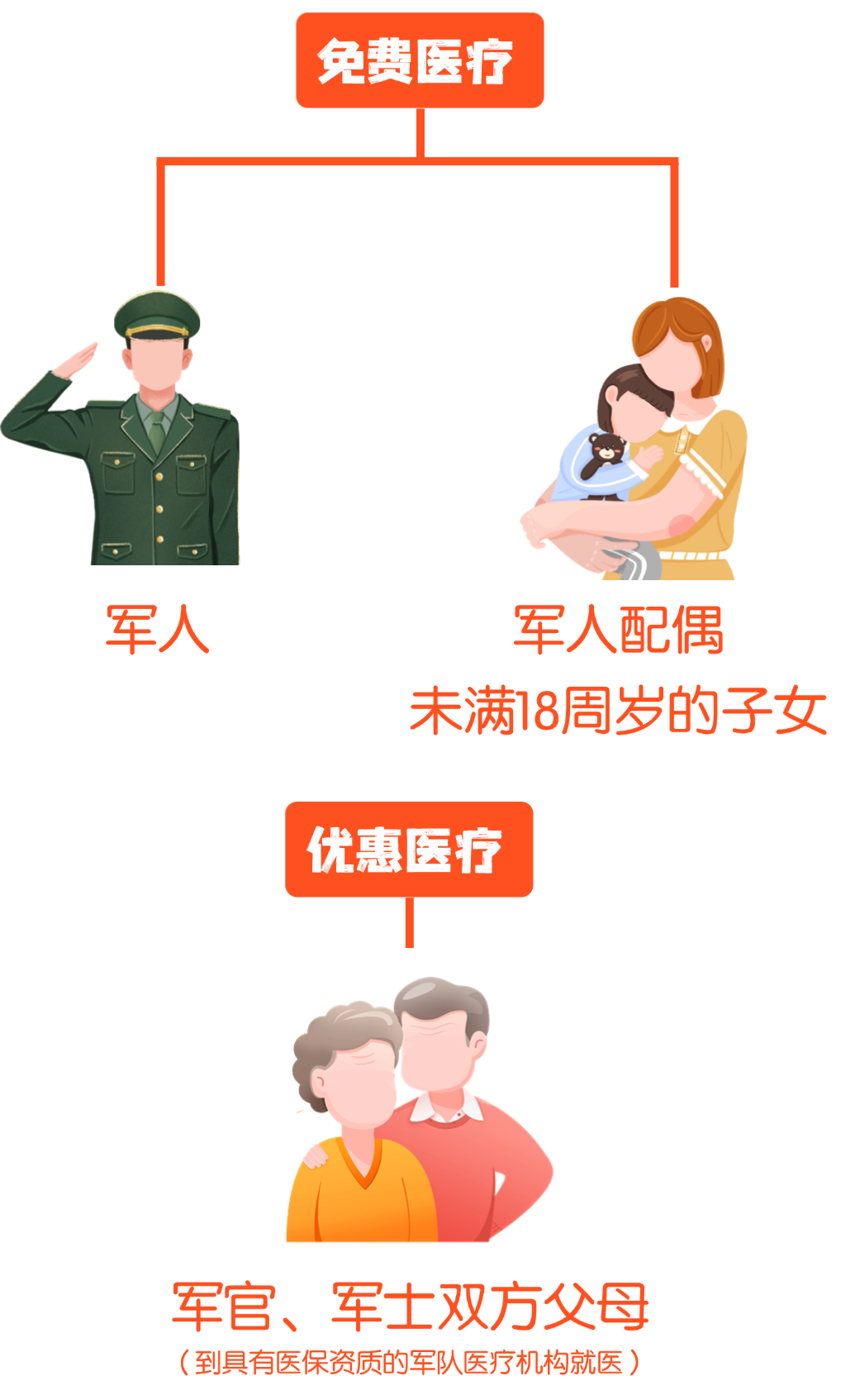 根据2022年1月1日开始实施的《军人及军队相关人员医疗待遇保障暂行规定》,除了军人免费医疗外,军人配偶、未满18周岁的子女免费医疗,军官、军士双方父母到具有医保资质的军队医疗机构就医的,在医保结算并扣除完全自费部分后,门急诊费用减免20%,住院费用减免50%。